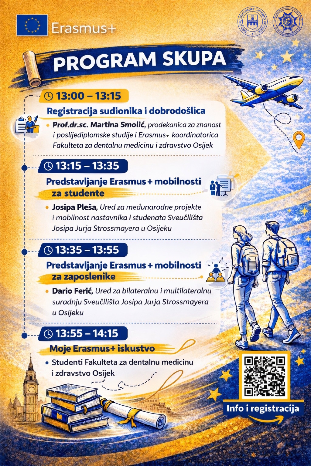 srdačno vas pozivamo na Erasmus+ Info dan, koji će se održati u ponedjeljak, 2. ožujka 2026. u 13:00 sati u Vijećnici Fakulteta za dentalnu medicinu i zdravstvo Osijek (Crkvena 21).